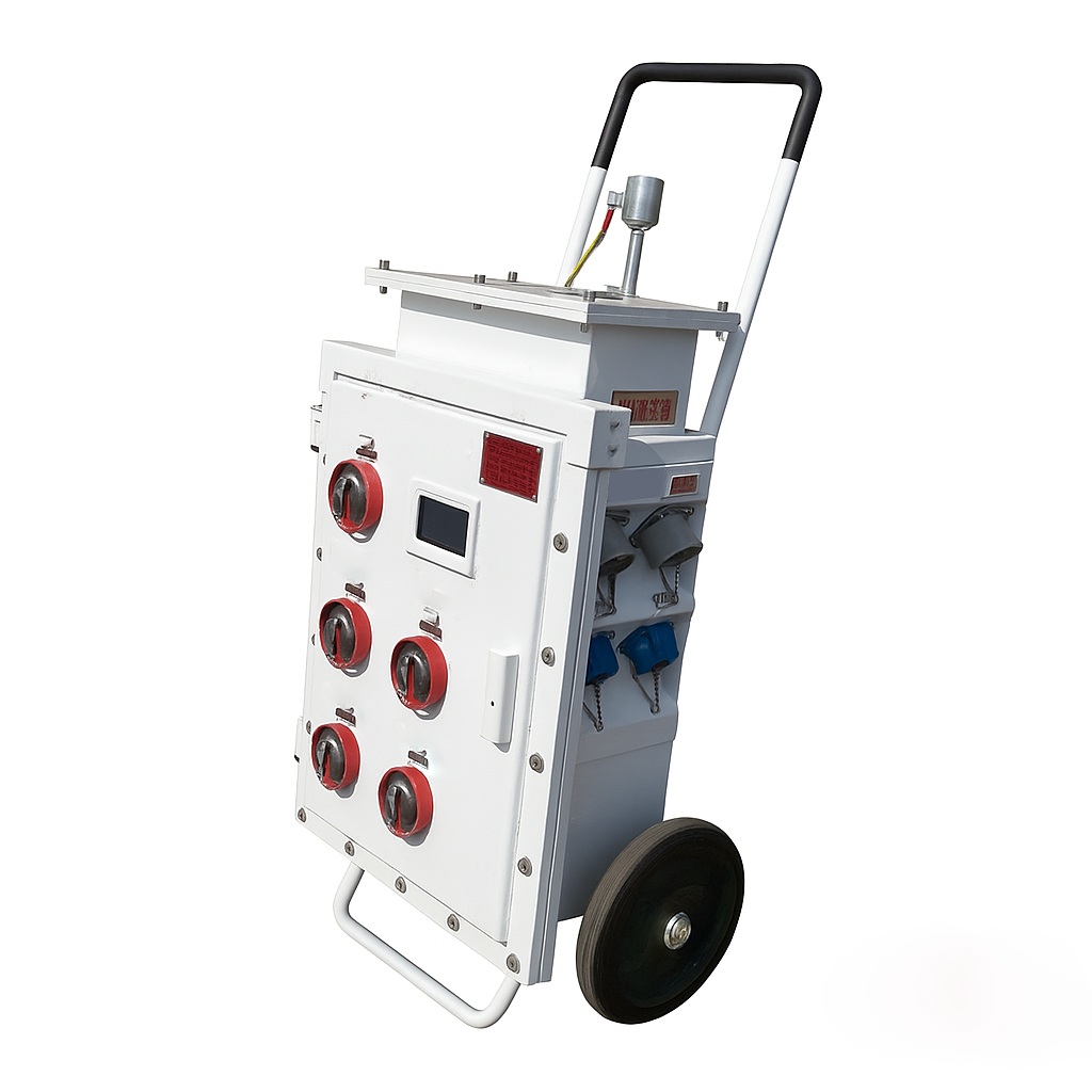 移动式防爆安全箱(简称移动电源)是为临时用电场所而研发设计的产品,采用液晶显示电压、电流、漏电电流三项数据,微电脑实时监测显示在用电过程中线路和设备的安全用电情况,方便现场人员对用电安全做出判断,是适用于IIB、IIA类爆炸性气体环境、频繁移动用电场所设备的新型防爆电源。